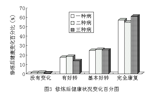 调查结果表明,修炼前患一种疾病的有2,547人,占20%,患二种疾病的3,004人,占23.6%,患三种以上疾病6,341人,占49.8%,有病人数合计11,892人,占总调查人数的93.4%,见图2。修炼后健康状况变化见表3,完全康复6,962人,占58.5%;基本好转2,956人,占24.9%,修炼后祛病总有效率为99.1%。将三种不同程度患病者修炼后身体变化状况,作健康状况变化百分图(图3)。