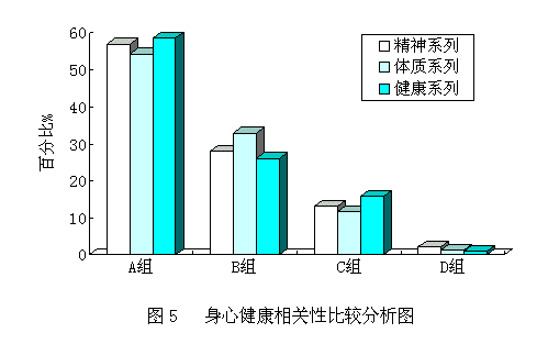 将精神、体质、健康三方面在修炼后的变化情况进行横向比较(图5),做身、心健康相关性分析。图5中精神、体质、健康三系列与修炼后身心变化各项程度指标的分类对应关系见表9。由图5可见,疾病的康复、体质的增强和精神状况的改善相互成正比关系。