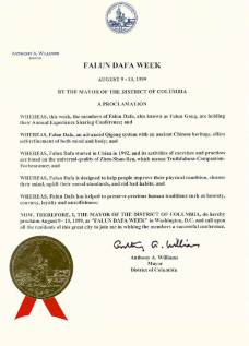 因此,我,华盛顿哥伦比亚特区市长,正式宣布1999年8月9日至13日,为华盛顿哥伦比亚特区“法轮大法周”,并且呼吁这座伟大城市的所有居民和我一起衷心祝愿法轮大法华盛顿心得交流会圆满成功。