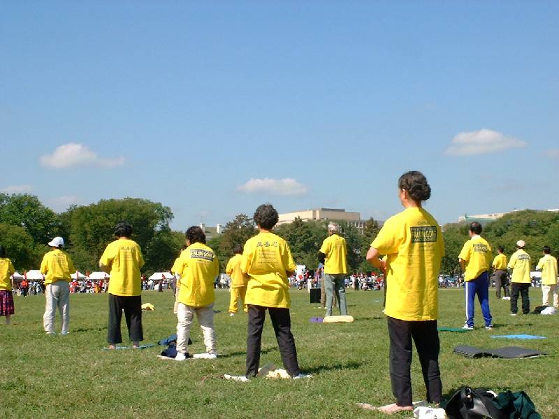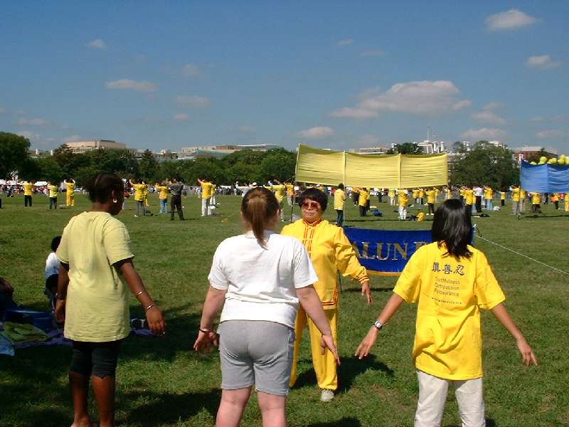 9月30日上午,来自大华府地区、费城、德拉华、彼兹堡、西弗吉尼亚等地上百名法轮功学员来到白宫大草坪参加中国文化节洪法,向世人介绍中国文化精粹--气功之精粹法轮功的真相。在场地上学员们搭起两个帐篷,分别悬挂师父《融法》和《同化》两篇经文,拉开数个大横幅及数十块展板,并用几十个黄气球装饰,非常美观,吸引了无数来参加中国文化节的中西方人士前来观看、询问、学功。随着炼功音乐响起,近六十名学员排着整齐的方队,一遍一遍地演示功法,整个活动从上午9点半到晚上9点半,其中晚7点至9点半是烛光守夜活动,大家都认为海外学员和国内学员是一体,我们应该同呼吸,共命运,一起“助师世间行”。