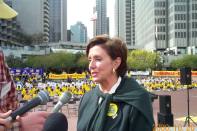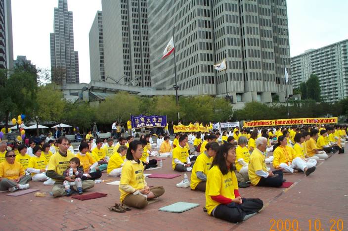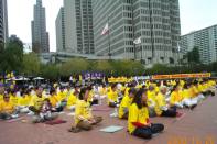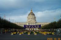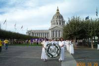 | 旧金山市政广场集体炼功 | 学员列队进行游行 | 新闻发布会集体炼功 |