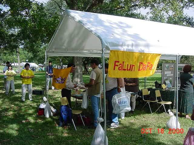 一个多小时炼功结束之后,一些员工上前与学员们交流。一位专程从夏威夷飞来参展的田径教练,与我们交流了很多,他学过佛教和多种气功,十分喜爱我们展示的法轮功法,我们知道他远道而来特意送给他教功录像带和大法资料,他非常感动,合十称谢。一位老工程师练过其它气功,他告诉我们他感受到很强的能量流在我们周围,并当即表示要学法轮功,并借走了教功录像带。一些员工连连称赞法轮功动作庄严优雅而且免费教功,他们说中国政府镇压法轮功实在不可理喻,不少人留下姓名和电话表示希望参加即将在周末举办的洪法班。