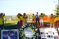 与辩论会相对的华盛顿大学棒球场内,有一些团体在进行抗议或呼吁。其中法轮功学员的队伍很是醒目。在一用以悼念59位被中国大陆迫害致死的花圈后面,身着黄色T恤的30多名学员在静静地一遍遍炼习5套功法,与摆在四周的种种目不忍睹的受迫害照片形成相互衬托、对照和呼应。