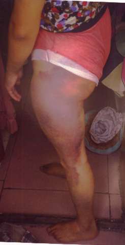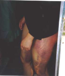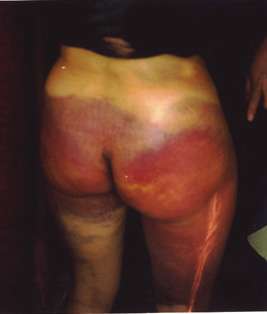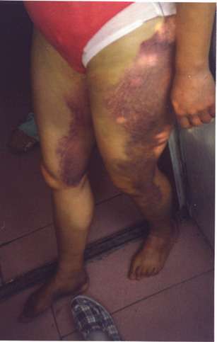【明慧网2000年10月27日】 我是10月17日在天安门广场证实大法时被抓。关进天安门分局后警察象疯了一样用电警棍和双脚在我全身施暴几个小时,我被打得遍体鳞伤(有照片为证)后,几个警察强行把我压倒要给我注射一种针剂,它们说是一种“疫苗”,我拼命挣扎,它们才罢手,可另一个警察硬是给我鼻子里滴进了一种气味呛人的药水,很快药效发作:大脑迷糊,神智不清,胸闷气憋,口干舌燥……当时的痛苦真是无以言表。接下来它们又开始逼问我住址、单位,我还是忍受着痛苦一言不发。无奈,它们把我脚绑在铁栏上,手铐在栏杆的最低处,使我既站不起又蹲不下,不知过了多久,我感觉不行了,迷迷糊糊中其他的功友将我背走。