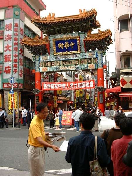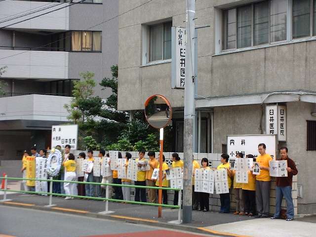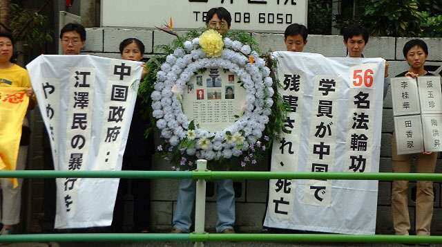 2000年10月2日上午10点开始,日本法轮大法学员60多人手捧镶嵌56名被迫害致死学员的像片及名单的花圈及“中国政府请制止江泽民的暴行”等标语,来到中国大使馆前请愿。使馆依旧铁门紧闭,拒不接受请愿书。