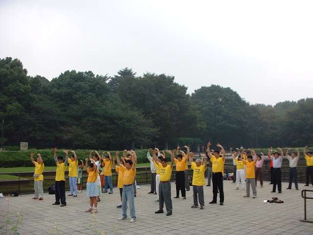 近百名法轮功学员在代表团驻地对面炼功,并向路人散发传单。请愿活动持续了三个小时。