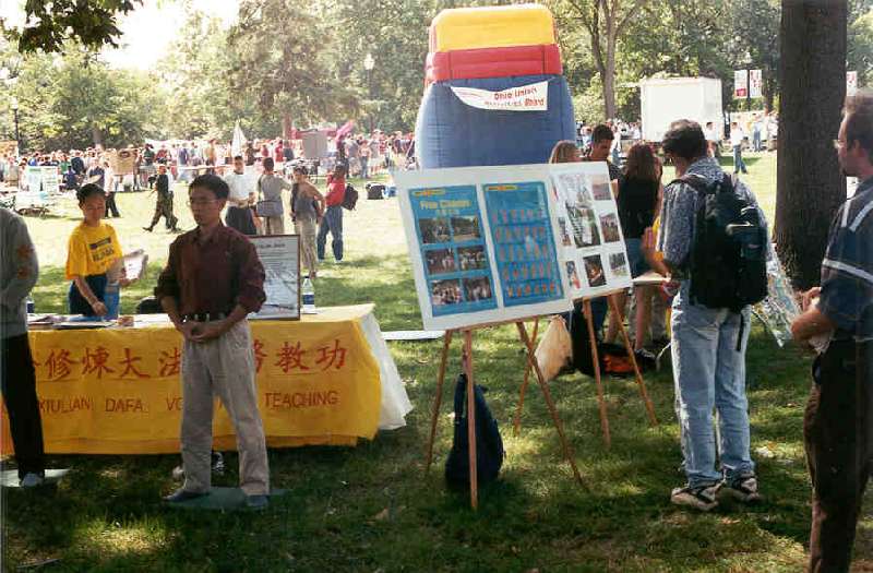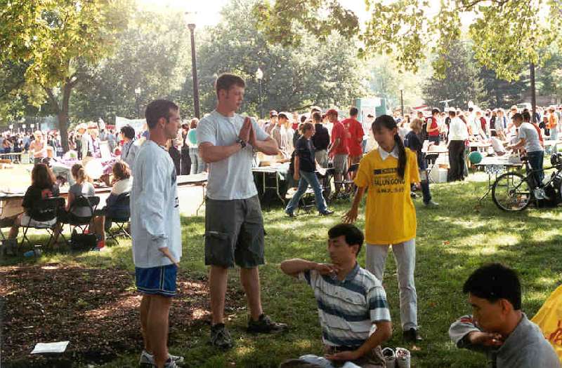 金秋季节,美国俄亥俄州立大学迎来了又一个秋季学期。九月十八日,学校各个学生团体聚集在校园中央的大草坪上欢迎新生,熙熙攘攘,场面很热闹。我们法轮功学员也申请了一块地方,炼功洪法。一天下来我们发出了大约几百分英文大法简介。我们还特别留意新来的中国学生,主动上去给他们材料,讲清真象。中文材料也发了不少。那天有趣的是第一个来到我们摊位的竟是校长先生。