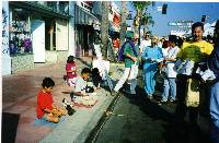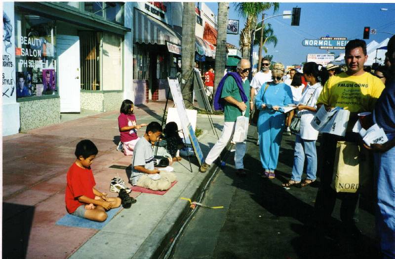 庙会的前两天,我们在讨论如何更好的向世人说明真相时,美国学员阿琳提供了这次庙会的信息并建议我们参加。另一个美国学员凯文自告奋勇去联系摊位并很快得到主办单位的允许,只要不影响别人,我们可以在任何地方炼功弘法。当我们到达那里时才发现,事情并不那么简单。整整三、四个街区被拦了起来,路中间摆满了摊位,那都是提前租的。路两边都是商店。我们要在人行道上设点,就势必挡在商店门口。我们选择的第一个地点就因为店主说我们影响了他的生意而不得不放弃。我们选的第二个地点是一家书店门口。刚架上展板,店主就出来了,冲着凯文嚷了足足两分钟。等他嚷完了,凯文心平气和的向他解释了我们是什么人,为什么来这儿,并对我们给他造成的不便致歉。听完后,店主立即转变了态度,不仅允许我们在他门口设点,还让我们明天还来他这儿。他告诉我们他是圣地亚哥书店联合会的成员。他给了我们一份该联合会成员书店的名单并建议我们在所有这些书店都放上大法书籍和宣传材料。然后,他说希望能得到一件印有“中国,停止迫害法轮功学员”字样的黄T-shirt。我们答应一旦加印,一定给他留一件。