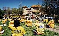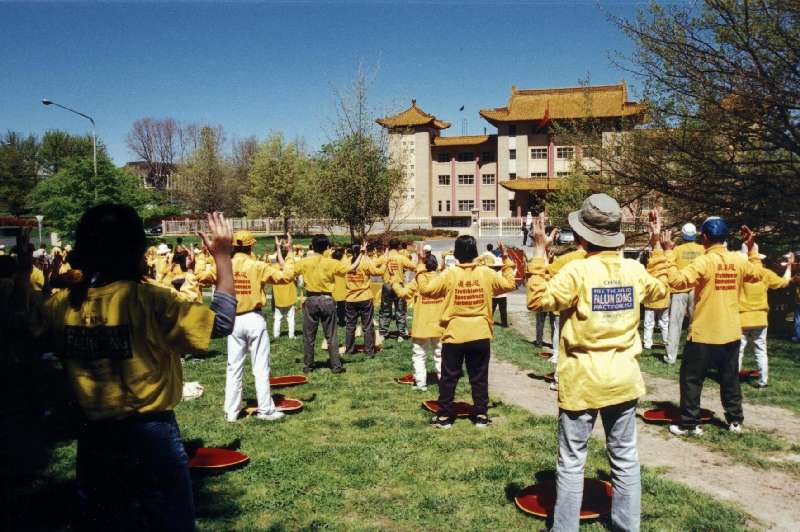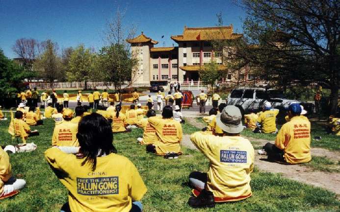 自从去年四月北京当局对法轮功进行镇压,海外各地法轮功学员自发性的请愿、弘法、动作频频,期望由外向内施压,祈求大陆当早日放法轮大法一条生路。十一年前来自中国大陆,现已归化美国公民的张少慧,自从去年「十一」国庆后,每周一至周五下午固定前往使馆天安门和平广场报到,不声不响静静炼功,一年来已成为康州大道过往人车所熟悉的固定景观。