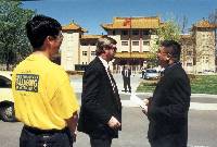 约十点十五分,忽然有人高喊:"快让开"。只见四名警察从广场中心抬着一位口喊“法轮大法好”的大法弟子往停放在东侧的警车处快速走来,但这位大法弟子在上车前拼命挣脱,向围观的人群喊出一声"法轮大法好!",一位警察为了不使其发出声音,用手指狠命地掐捏这个大法弟子的喉咙,把他推上了警车。与此同时,还有四名大法弟子也被推上了警车。警车窗帘立即全部拉上,开出广场。又有一辆空警车补上原来的位子。这时广场的西侧也在抓人,赶过去时,只见几个警察一齐殴打一位已倒在警车边上的大法弟子,另一位在车上的弟子高喊:"不许打人!"这几个警察仍不住手,直到把这位弟子推到车上去为止。其他武警和警察及便衣尽快驱散围观的人群(围观的游人很少,并表情麻木)。