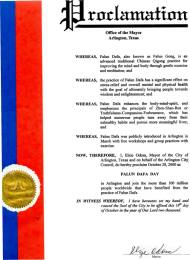 因此,现在,我,艾尔奇奥德曼,德克萨斯州阿灵顿市市长代表阿灵顿市市政委员会宣布2000年10月28日为阿灵顿市“法轮大法日”,并加入全世界已经使一亿多人获益的法轮大法修炼群体。