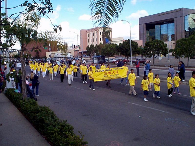 周六上午,学员们和其他游行队伍聚集在郡政府大院一同等候出发。 部分学员利用这段时间席地打坐,这吸引了挨着我们队伍的女童子军围观,看到众多的孩子们观察的那么专注,几个学员就坐下来教她们第五套功法。令人感动的是她们每个人都学得非常认真。这时领队的则跑了过来索取资料,表示会与学员联系将来学功的事宜。上午11点,游行准时开始。开头是举着牌子的童子军,每块牌子分别标出了美国参加过的历次战争的伤亡失踪人数,然后是举着军旗的退伍军人。跟着的队伍里有参加过二战、韩战、越战等的退伍老兵和被俘军人,有各当地驻军的仪仗队,有高中军训营的学生,有高中的军乐队,最后是法轮功的队伍。法轮功的队伍以中英文蓝底黄字的法轮功横幅为先导,六名小学员紧随其后,身着黄T恤衫的近五十名学员排成四路纵队在普渡济世的音乐声中行进,受到了路边观众的热烈欢迎,人们不断地向我们挥手,欢呼,大家也向观看的行人微笑挥手致意,形成了场内外融合一体的祥合场面。几名学员散在队伍两侧向观众分发报纸传单,很多人更是主动上前索取资料,最后当队伍经过检阅台前,主持人在扩声器中宣布:“现在走过来的是法轮大法的队伍,法轮大法是修炼身心的功法,遵循真善忍。”此时,周围响起了热烈的掌声。