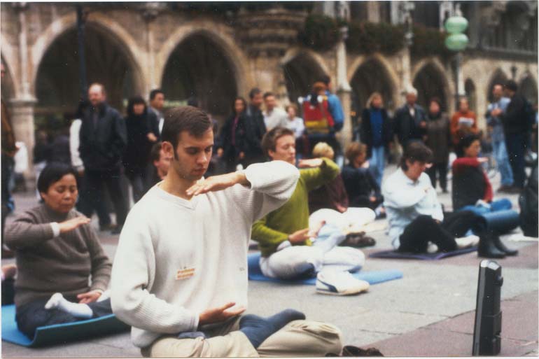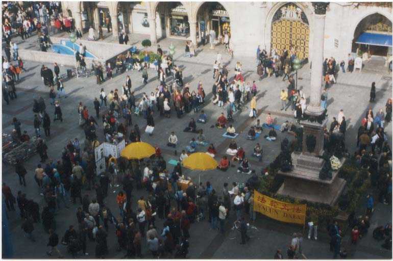 为了揭露其恶行,呼唤正义的人们共同制止其暴行,部份德国和奥地利大法弟子于十月和十一月两次在慕尼黑市中心的市政厅广场前炼功弘法和向世人讲清真象。