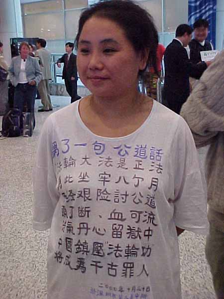 她,身穿白衬衣,外套红毛衣,身无分文,没一件行李,捧起学员送上的鲜花笑着说:谢谢你们。一位学员与她握手时说不出话。是啊,我们应该谢谢她,而小张却说:你们在国外护法了不起。然后她脱下红毛衣,白衬衣,露出一件白色短袖T恤,上用笔写道: