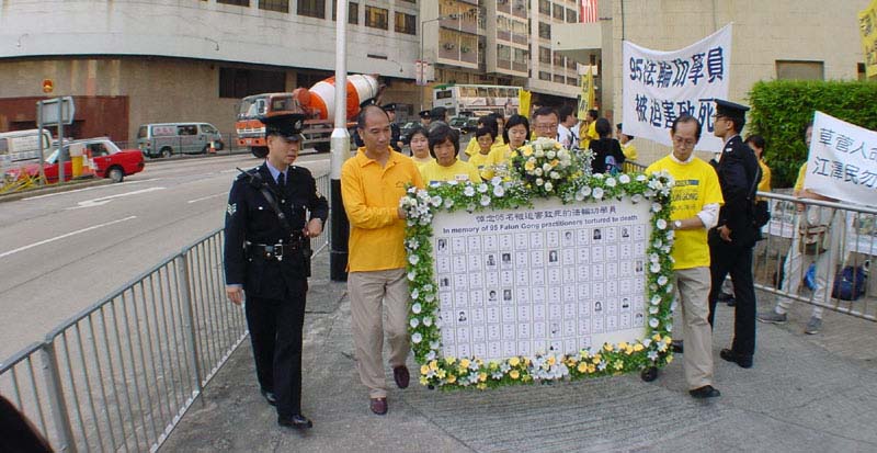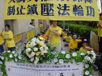 ![]() 4.学员捧着纪念死难者花圈走向中联办递信 | ![]() 5.在中联办对面炼静功 |