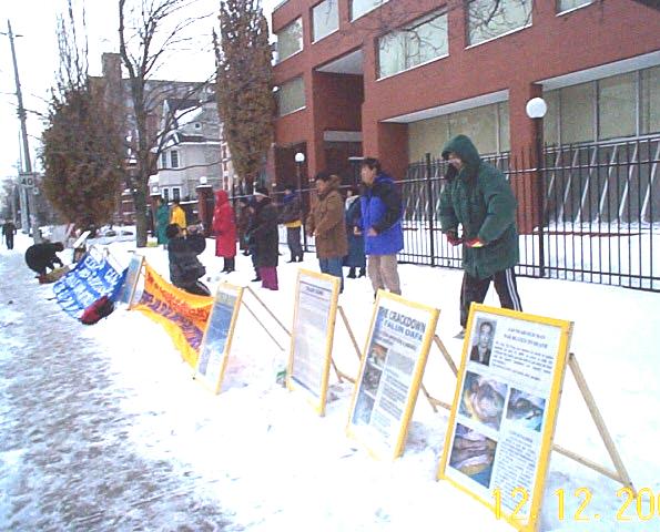 【明慧网2000年12月15日】 多伦多从昨天开始大雪纷飞,今天(12月12日)凌晨已有1尺多厚的积雪。大风加大雪使多伦多的气温降到了摄氏零下26度。寒冷的天气,阻塞的交通,没有阻挡住大法弟子继续到中国领馆和平请愿。有的功友照例提前1小时到领馆门前派送报纸,有的功友在寒风中不顾把手冻僵一直举着要求中国政府释放张昆仑教授的横幅。江泽民之流一天不停止对法轮功的