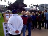 美丽的海景、成群的海鸟和优美的动作吸引了很多人。有一位游客情不自禁地走到我们旁边也跟着炼了起来。很多人表达了对我们的支持。有一次,四个游客在展板前停下来观看,没等我们学员上前,其中的一位女士已经开始向其他三人介绍起中国政府对法轮功学员的残酷和法轮功的英勇抗争。离去前,这位女士双手合十祝我们成功。我们体会到,已经有越来越多的美国人知道了真相并支持法轮功。