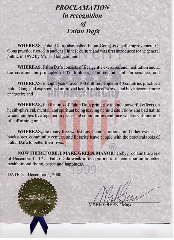 现在,因此,我,马克.格林,联合城市市长,宣布12月11日至17日为法轮大法周,以承认法轮大法对改善健康,道德生活,和平和幸福做出的贡献。
