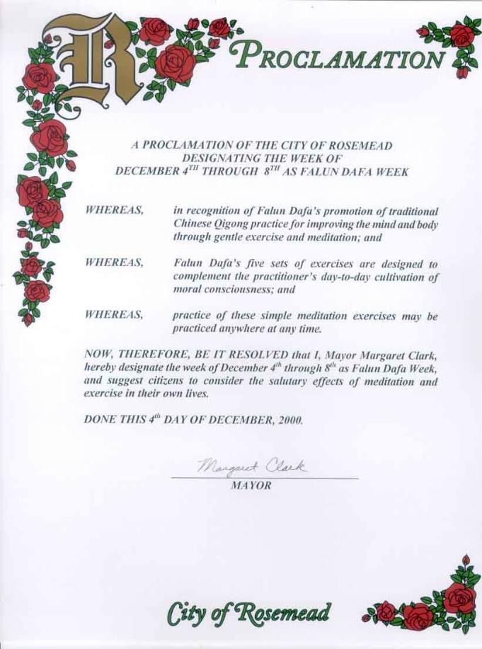 柔似蜜市(Rosemead)指定2000年12月4-8日为法轮大法周鉴于, 法轮大法通过柔和的锻炼和打坐改善人们的身心, 发扬了中国传统的气功修炼并得到了广泛的承认; 并且,
