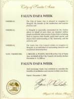 因此,我,米哥尔.A.普利多,圣塔安娜市市长代表本市议会宣布二零零零年十二月四至八日为“法轮大法周”,并鼓励圣塔安娜市市民考虑打坐和锻炼对于他们生活的益处。