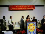 国会及地方政府官员代表,相继在法轮大法认知月典礼上赠予法轮大法荣誉奖牌,由学员代表摩丝(讲台前)接受。(图由新州法轮功提供)