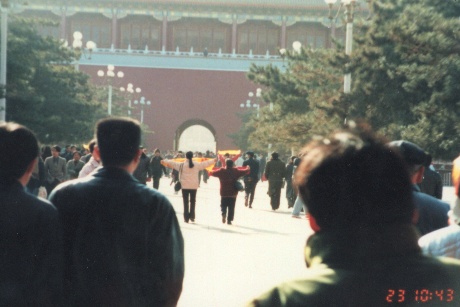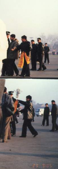2000年12月23日,天还没亮,在天安门金水桥上有一个老年女弟子,打出一个横幅,同时高喊:“法轮大法好,法轮大法是正法……”这正义的呼声吸引了众多来看升国旗的游客的目光,紧接着在看升国旗的群众里,有一家三口大法弟子,男功友抱着小孩喊:“法轮大法好....”之后被警察捂住嘴,一家三口被拖上了警车,上车后,男功友打开车窗,向游客喊:“法轮大法不是邪教,请世人清醒....”这喊声竟使围观几个游客落泪,警察慌忙把车开走……。升完国旗后,一直到中午,法轮大法的横幅,“法轮大法好”的呼声在天安门广场此起彼伏,一直没停,图1是上午9点05分时,一30多岁的男功友打横幅时被抓,图2是10点43分,三名女功友在天安门北侧各打出一面横幅并高喊“法轮大法好”,广场上还有一名80多岁的老功友,拄着拐棍,被一50多岁的功友(可能是她女儿)搀着,喊:“还李老师清白!”,过来一帮便衣、警察把她们围住,连推带搡往车上推,女功友不主动被邪恶带走,和警察据理力争。在光天化日之下,当着层层围观游客的面,警察(不是便衣)连打她嘴巴子,还有几个没带横幅的5、6个60岁左右的男功友举着手在广场大喊:“法轮大法好,法轮大法是正法”……一车一车功友被拉往天安门分局,天安门分局院内护法再现高潮,每进去一车功友,同修们便一起鼓掌欢迎,相互鼓励,并齐呼:“法轮大法好,……”,有的警察听到后,吓得都不敢靠近。下午1点多钟,在天安门分局院内,发生了这么一件事:一个20多岁的警察看到一弟子在高喊“法轮大法好”,就拿着电棒过来电他,他刚靠近,所有被抓的大法弟子一起对警察喊:“窒息邪恶,窒息邪恶……”,这正义的呼声真起到了“神鬼惧十分”的作用,把这个警察吓得拿着电棒乖乖退走了,过了不一会儿,他又拿着电棒过来想电弟子,大家又同声呼喊“窒息邪恶,窒息邪恶!”,他又一次灰溜溜地走了。