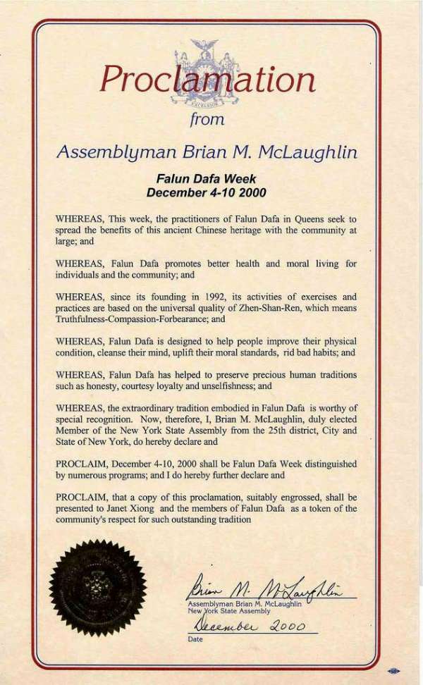 【明慧网2000年12月6日】纽约州众议院议员布莱恩.迈克劳夫林宣布两千年十二月四号至十号为“法轮大法周”。