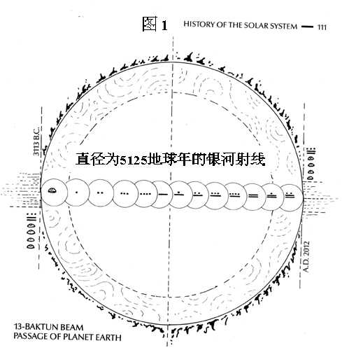 据称为“族尔金”的玛雅历记载,在银河季候中我们的太阳系正经历着一个历时五千二百多年的“大周期”(The Great Cycle) 。时间是从公元前3113年起到公元2012年止。在这个“大周期”中,运动着的地球以及太阳系正在通过一束来自银河系核心的银河射线(Galatic Beam)。这束射线的横截面直径为5125地球年。换言之,地球通过这束射线需要5125年之久。(见图 1)