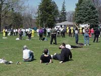 【明慧网2000年4月11日】很多美国学员在自己住家附近参加了4月8日“世界气功和太极日”活动,演示并教授法轮功功法,受到欢迎。下图是麻省Framingham40多名学员向群众教功的场景。