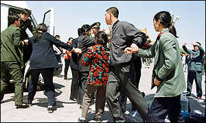 北京的便衣和武装公安23日在天安门广场将一群法轮功女信徒逮捕,并押进厢形车带走。这11名妇女被逮捕前,正面对天安门广场炼功。4月25日是约一万名法轮功信徒包围中南海一周年纪念日。(美联社)