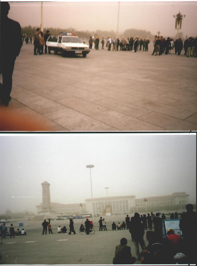 上图拍摄时间是“4.25”上午9点到9点30分。警察把整个广场的人清光,把游人全部撵到广场之外,同时开始抓大法弟子。当日上午,天降尘埃,偌大的广场之内空无一人。