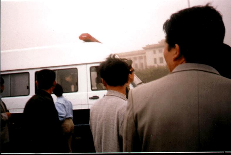 上图拍摄时间为“4.25”上午9点50分左右,黄沙漫天,途中的警察正在天安门广场往警车里抓大法弟子。