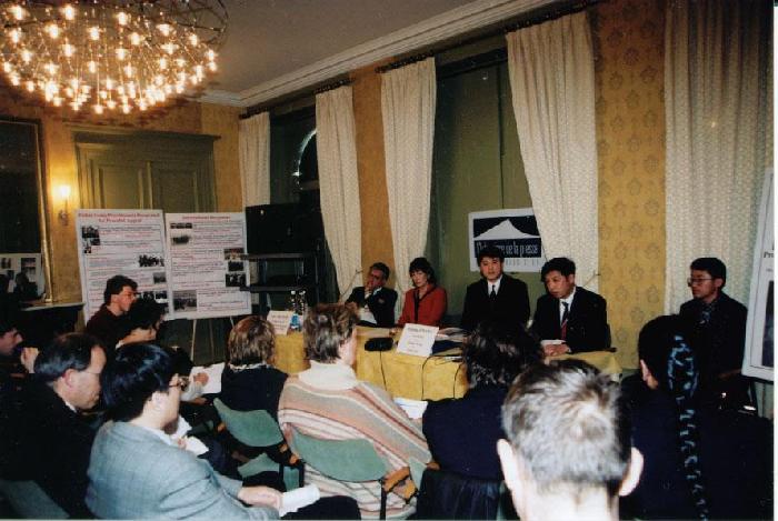 【明慧网2000年4月8日】法轮功学员在日内瓦法轮功记者招待会,2000年3月20日摄于瑞士日内瓦