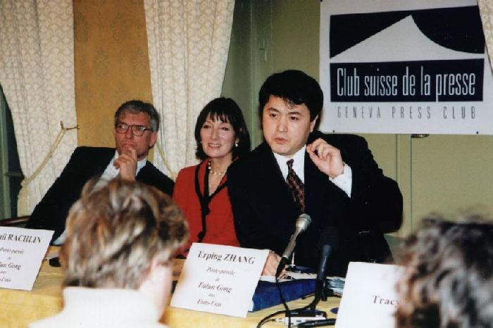 图片资料:法轮功学员在日内瓦法轮功记者招待会