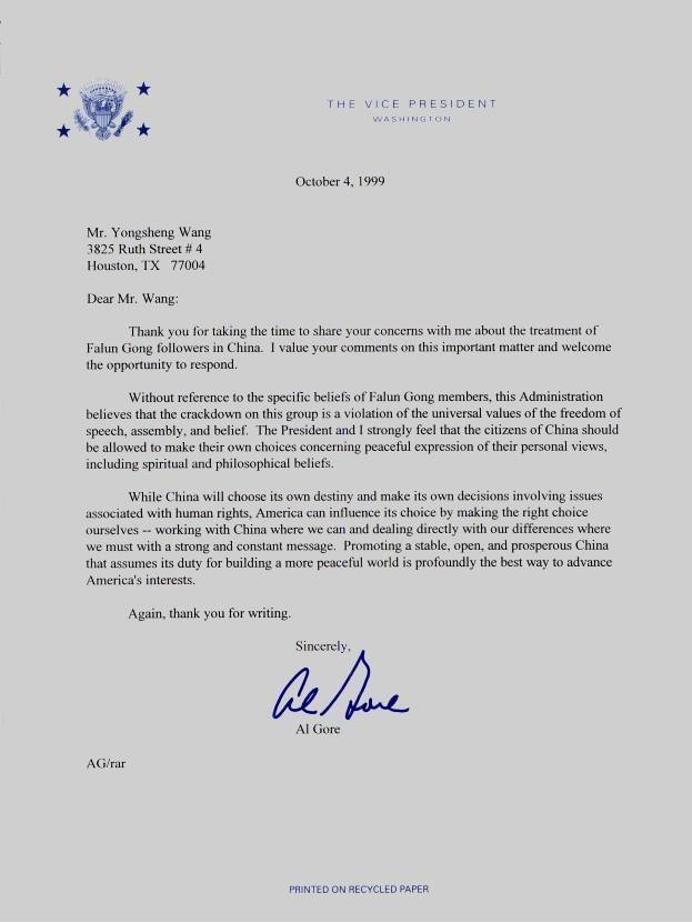 谢谢你关于法轮功修炼者在中国所面临的处境的来信,你的观点和你对我所处位置的关心令我赞赏。