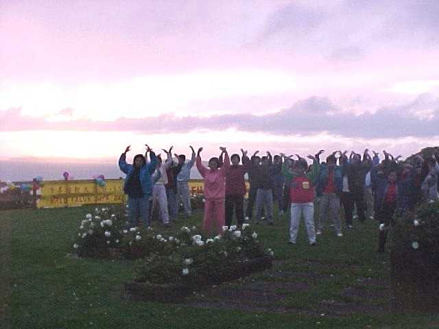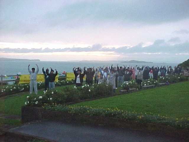 由于新西兰是第一个见到日出的国家,所以我们在奥克兰选择了依山傍水的Misson Bay 弘法炼功。 早上六点半,五、六十名东西方弟子趟着露水,在微熹的晨光中,迎着强劲的海风,冒着蒙蒙的细雨,来到了Michael Savage Memorial at Bastion Point 公园山坡。约七时许,在祥和的大法炼功音乐中,我们迎来了旭日东升,世界法轮大法日的第一道曙光。
