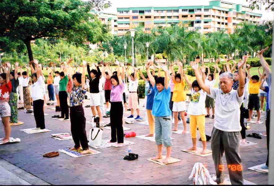 下午5点至7点,130多名学员在新加坡榜鹅公园集体炼功、弘法。其中有10多名小学员组成的炼功队伍别具特色。许多游人驻足观看或索取大法资料。