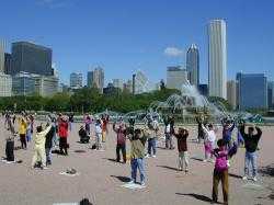 【明慧网2000年5月17日】五月十三日,经过了几天风雨冲刷后的芝加哥显得格外洁净而又妩媚娇艳。在蓝天白云映衬下的密西根湖更令人心旷神怡。清晨,大芝加哥地区的学员从四面八方纷纷汇集到市中心著名的白金汉喷泉广场。在晨风中拉起了“法轮大法”和“真善忍”等横幅,法轮大法学员们在祥和而又庄严的气氛中炼功。在这特殊的日子里我们向世人展现了法轮大法修炼人的风采。这种宁静的气氛象一块巨大的磁铁吸引着晨炼的市民和观光的游客。中西方的主要媒体也前来采访报道。专门拍摄芝加哥风光的摄影师前来抓拍这难以忘怀的场面。一群来芝加哥游玩的中学生兴奋地加入了我们炼功的行列,在学员的演示下炼起了“法轮周天法”。