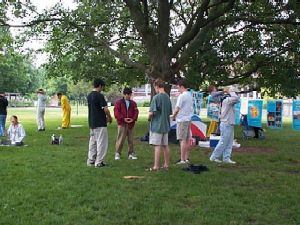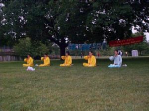 天气虽然不是很好,但过往的游人却很多,他们不时地驻步观看学员们炼功,索取大法资料。学员们热情地用中英文向他们介绍法轮大法,并教他们炼功的动作。一些中国国内炼过法轮功和对法轮功感兴趣的人们也前来询问了解情况,其中有一位刚从北京来哥伦布市探亲的功友没想到在这里还能找到炼功点,有缘和大法弟子遇到一起,感到非常高兴。
