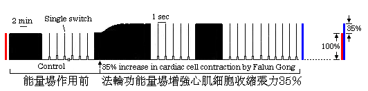 图1.心肌细胞在法轮大法能量场中收缩张力增强35%。在对细胞施加能量场前,细胞处于稳定的收缩状态。经历了30分钟的对照记录后,法轮大法修炼者在30厘米以外处用双手抱轮对细胞施加炼功场,并持续炼功。细胞收缩开始明显增强。大约在5分钟后,张力比原来的对照值增加了35%,而后稳定于增加后的状态。