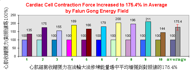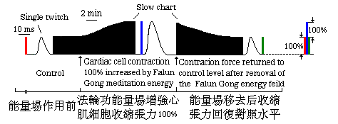 将单离的大白鼠右心室乳头肌细胞置于法轮大法的修炼场之中,用以测定其收缩张力在该能量场作用下的变化情况。能量场由一位法轮大法修炼者在其炼功中用两手作抱轮动作而形成。抱轮的两手分别置于距离细胞大约30厘米以外的位置,以确保细胞所处物理温度不受影响。整个试验过程中修炼者始终不触及实验系统装置。测试操作由另外一名非修炼者技术人员进行。在30分钟的对照测试中,细胞在一恒定的收缩张力水平上保持稳定。而当对其施加上述炼功场后,细胞收缩张力开始稳定而明显地增强。在数次重复实验中,在施加炼功场后大约五分钟之后,其收缩张力与对照值相比平均增强了75.4%,而后稳定在增强后的收缩水平上。这期间没有额外供给任何生物化学能和物理能,说明在心肌细胞收缩张力的增强过程中,炼功场提供了某种尚未得知的能量物质。