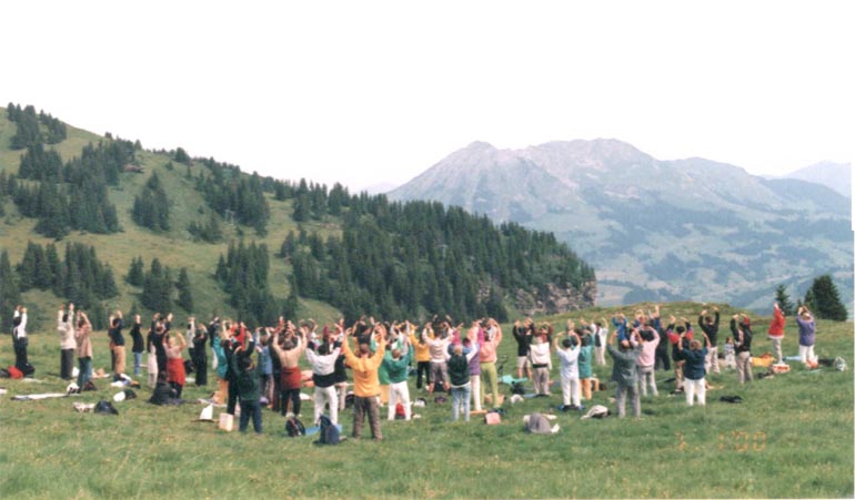 2000年6月,参加联合国发展会议的欧洲学员在瑞士阿尔卑斯山上的集体炼功