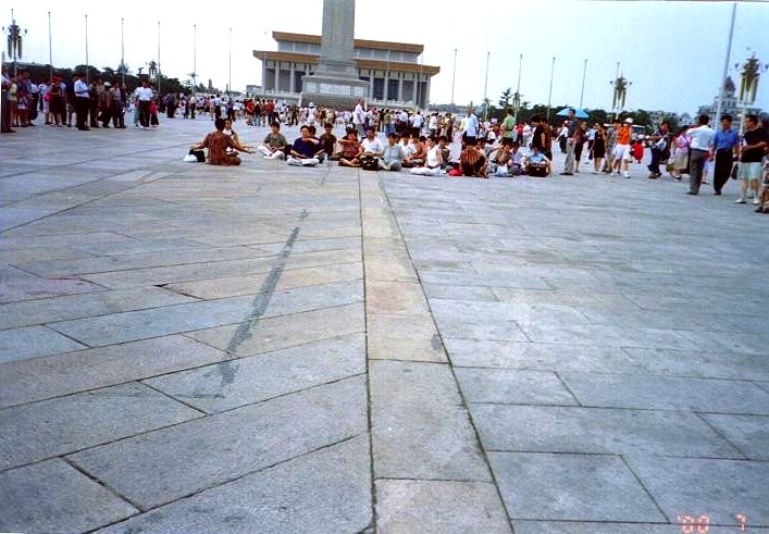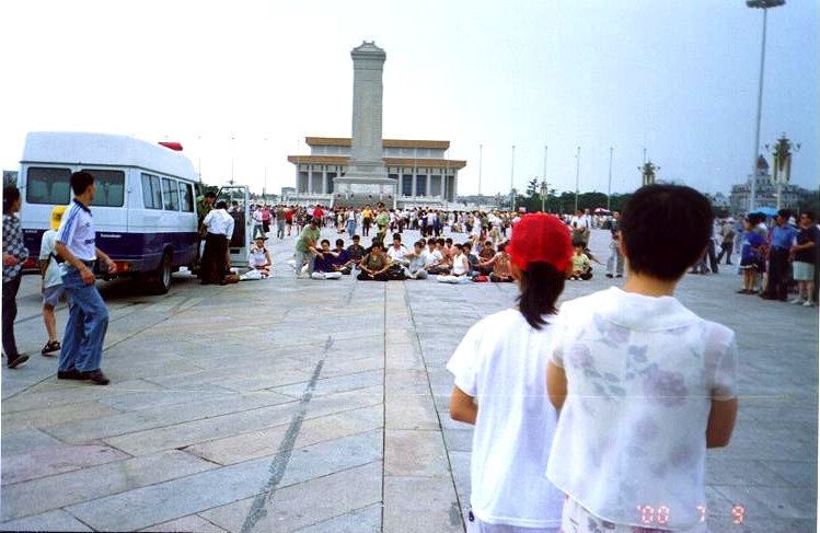 7月9日9点钟左右有5位功友开始在天安门广场打坐炼功(第一张照片),警察及便衣迅速围了上来,大家泰然处之,没有人害怕也没有人动,就在警察叫警车的时候,又有20多位功友迅速加入到炼功队伍中来。学员们是那样的祥和、那样的坚定,我流着眼泪拍下这些照片,很难用言语表达此时的心情,共同精进吧,功友们。
