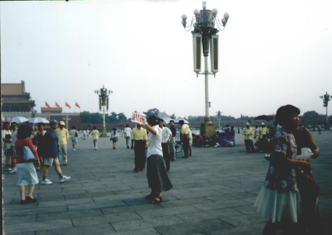 11点20分两名老年女学员拿着自己写的白色横幅“大法好”出现在天安门广场,她们一边打着横幅转圈,一边向游人说:“法轮大法好”,不一会儿便被抓。