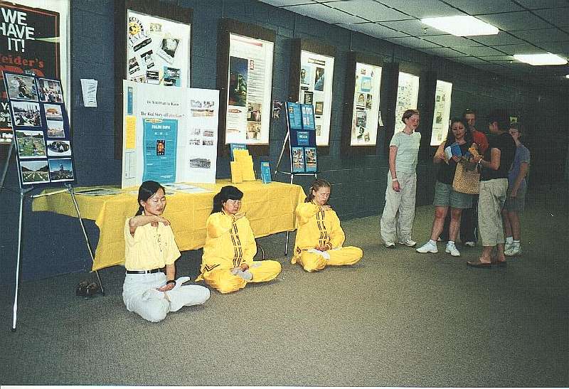 由于各方面的努力,主办单位给我们安排了一个很理想的展位,既远离喧闹的室外游乐活动,又位于连接室外、室内活动的主要通道。学员们精心制作了许多图片展览,从不同侧面向游人展示了法轮大法简介、五套功法的图示、法轮大法在世界各地的洪传及大法真象和事实澄清。学员们同时又在展位附近炼功。整个五天的活动吸引了大批游人。