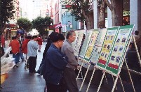中国城是中国旅游团必到之处。由于中国的一言堂的宣传,使这些中国游客对法轮功真象所知甚少,当他们看到这些图片时都很惊讶,有的说:看炼功的还有白人呢;你看这幅照片是当年那么多人炼功的场面;看那幅,给他们打得真够惨的;录相上的真人真事在国内可看不到,看来法轮功是真的!有的学员对中国的游客说:“中国的大好河山那么多为何还出来旅游呢,因为就想看中国没有的,这些在中国可看不到。”,游客也笑了:是啊!有的旅游团象是单位组织的,领队模样的人一进唐人街就说:“谁也不许要那些资料”,可还是有一些不为所动来索取资料的,就连领队模样的人也禁不住放慢了脚步目不转睛地看着图片展,从那疑惑的目光中能看出他们的几分茫然,纸是包不住火的。