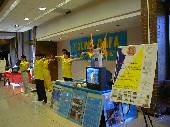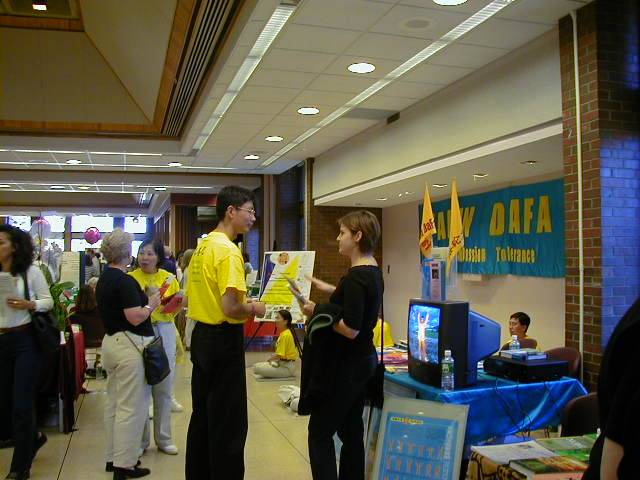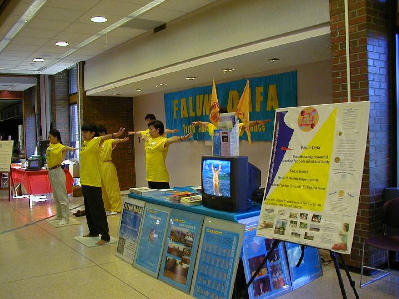 蓝底黄字的法轮大法横幅清澈明亮地悬挂在展厅的正前方,十分醒目。宽敞的展位前摆放着大法宣传板,展台上陈列着丰富的中英文的大法介绍资料,电视中连续地播放着大法功法教功带和大法简介录像带。随着悠扬的炼功音乐,学员们整齐地炼着五套功法,吸引着众多的参观者和参展者。