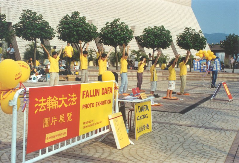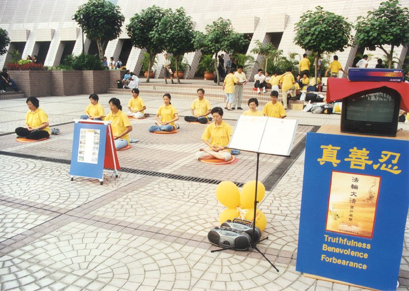 在学员做功法示范时,确实吸引一些途人驻足,但在大法遭受诬蔑和恶毒攻击的时期,许多有缘人确实被谣言障碍着,许多市民总是远远观看学员一言一行。负责咨询台的学员在猛烈的太阳下连续坐了几个小时,态度总是亲切和善,毫无怨言。一位想以法轮功为题做功课的大学生奇怪地问坐在露天广场学法的学员∶“你们不觉得很辛苦吗?”红光满面的学员摇摇头说∶“一点也不辛苦。”我们精神饱满的面貌使她有点不解,一位老学员便领着她参观图片和详细地介绍法轮大法。