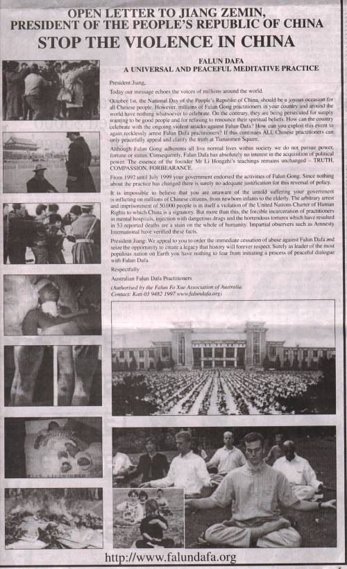 澳大利亚:主流报纸刊登法轮功学员致江泽民公开信