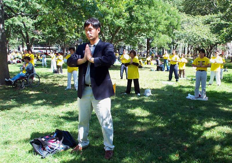 另一组学员在通往自由女神象的码头炼功、洪法, 向游人发放大法资料。不时有中国旅游团从这里经过,学员怀着真诚的善心, 将他们在国内不可能看到的法轮功真相资料递向他们, 回答他们不解的问题。一位瑞士学员说:“我很高兴能参加这一周的洪法活动,为中国大陆同修争取修炼自由尽点力。”下午部份学员继续在公园炼功洪法,大部份分成小组去市内不同地方洪法和介绍真相, 上万份各种介绍真相的资料发到了游人手里。一位过路美国人提到九月三日CBS播放的来访的中国最高领导人的事,学员问:“你相信他说的吗?”他说:“不,他是个大谎言家!”。